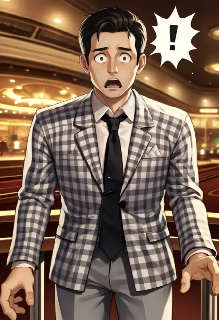 ベニー、茶色の髪、短髪、チェック柄のスーツ、黒いネクタイ、灰色のズボン