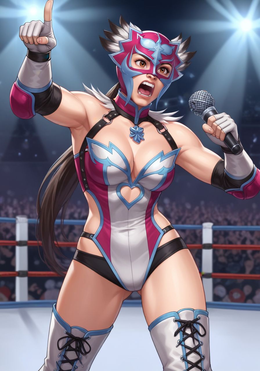 From Tekken Tag Tournament 2, it's the high-flying luchadora who definitely isn't Julia Chang in a mask, Jaycee. Trained from about 40 screenshots and key art.