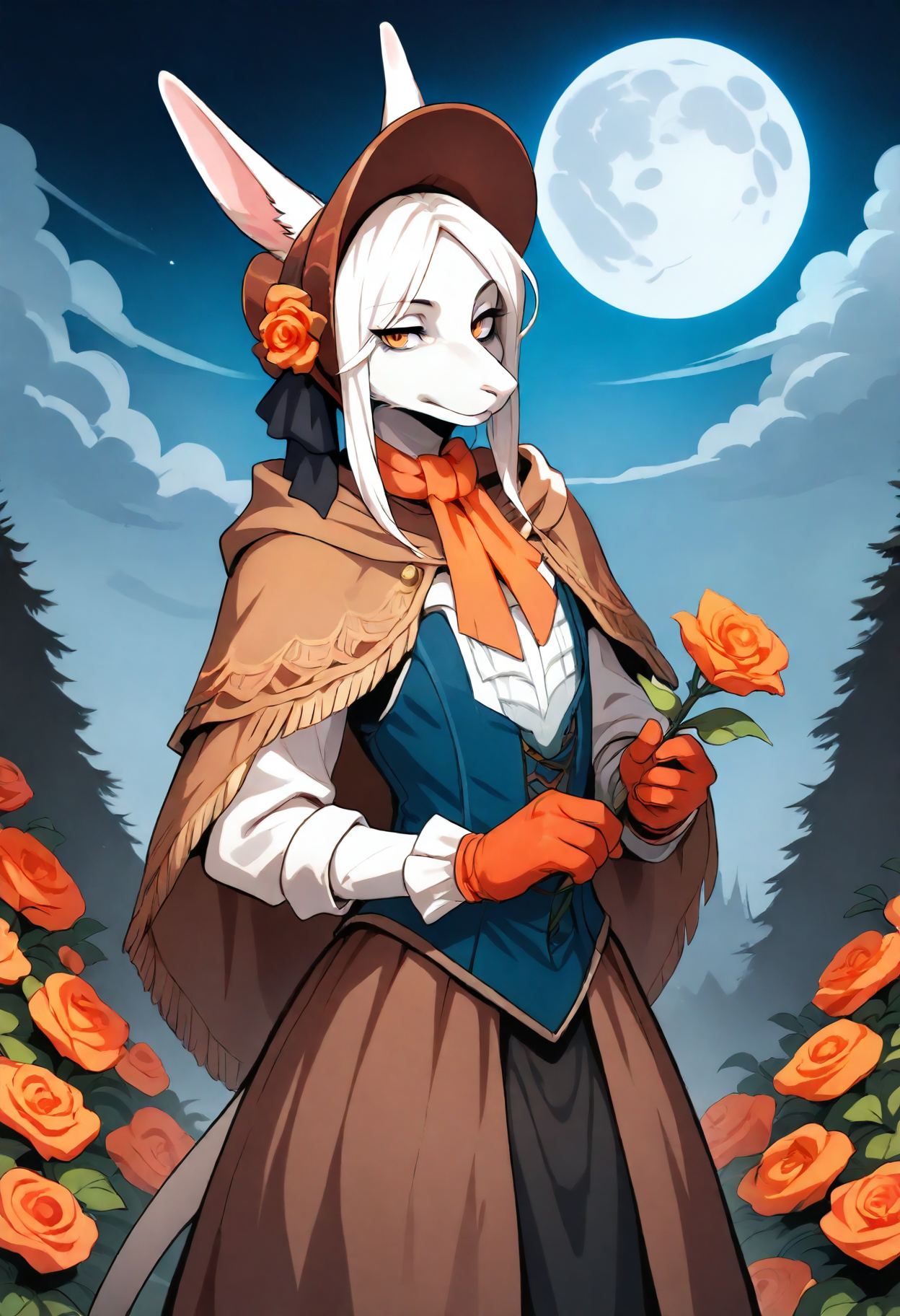 • Bloodborne Outfit: brown bonnet, brown cloak, dark blue skirt, bodice, orange neckerchief, pendant, bloodborne, victorian, gothic,