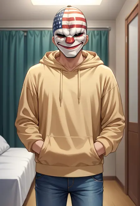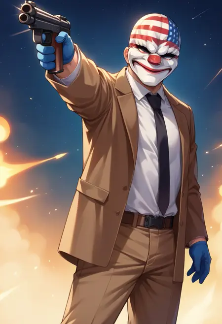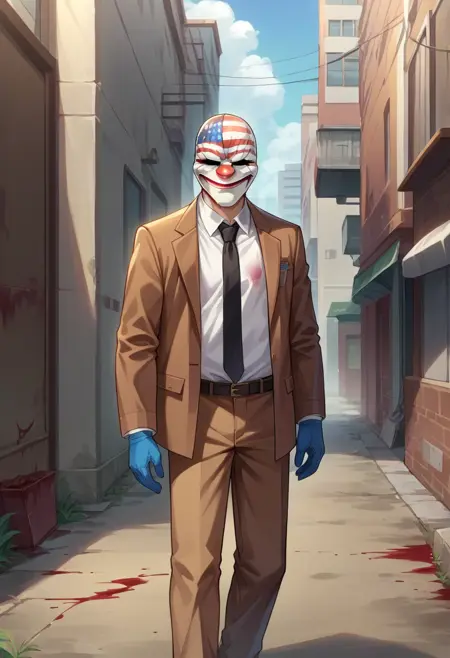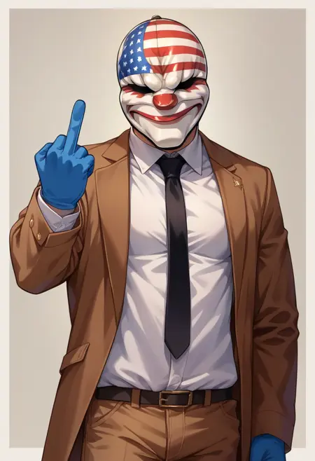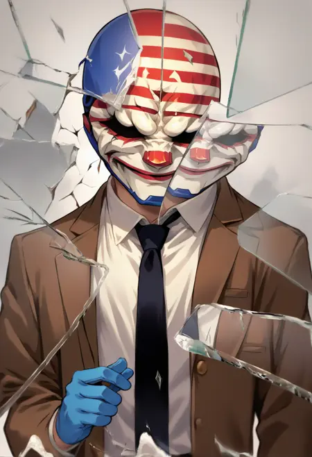DallasPD, mask, brown jacket, open jacket, black necktie, white shirt, dress shirt, blue gloves, brown pants
