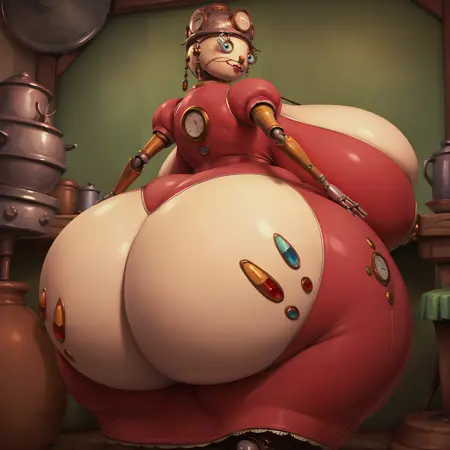 Aunt Fanny, large pink and white colored robot, dark blue eyes, enormous bottom,