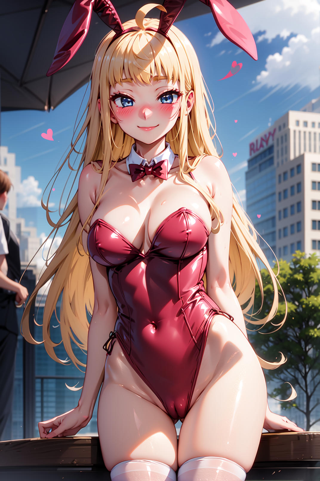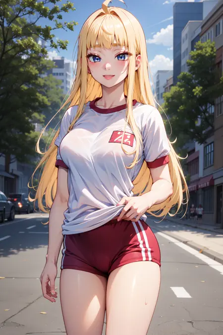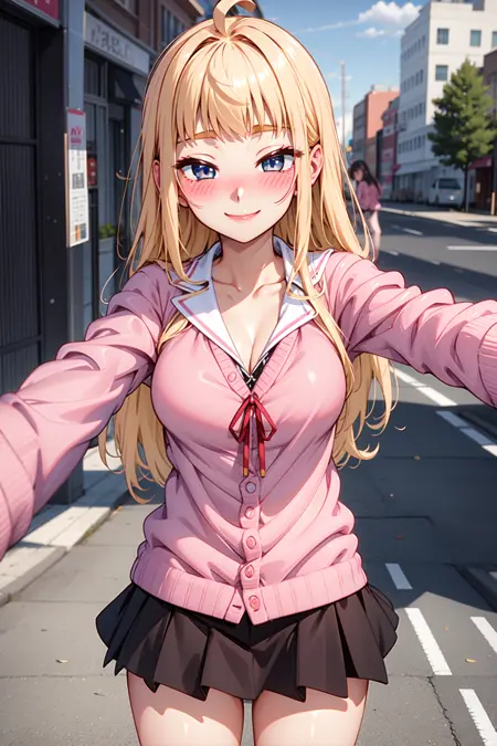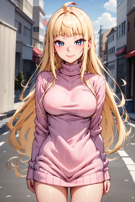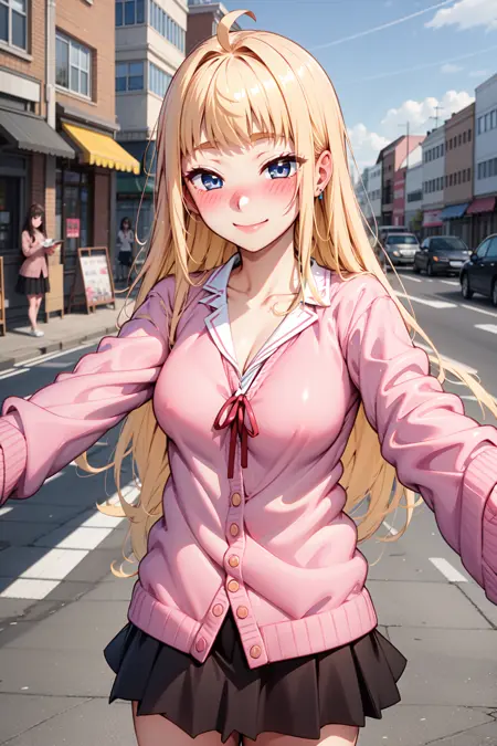 appearance: minami, blue eyes, eyelashes, blonde hair, blunt bangs, ahoge, long hair, sidelocks, jewelry