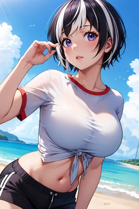 添加 "altTsubasa, multicolored hair, purple eyes, short hair" 以获得她的挑染发型。
