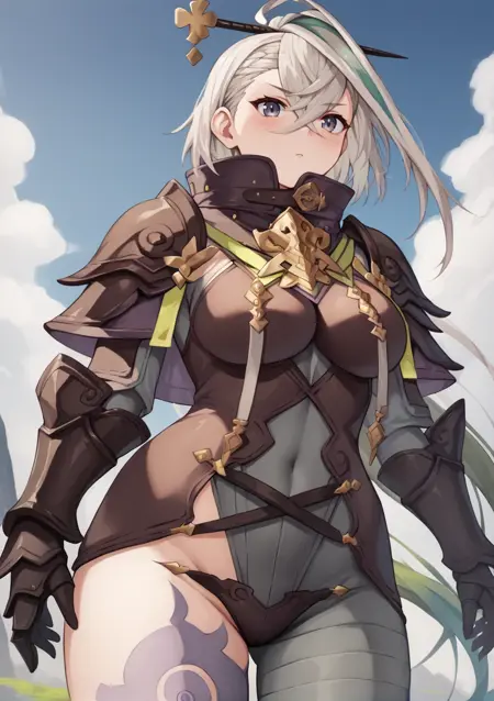 Her armor tags: grey bodysuit, high collar, armor, shoulder armor, single pantsleg, gauntlets, asymmetrical clothes, pauldrons, bodysuit, thighs, breastplate, covered navel