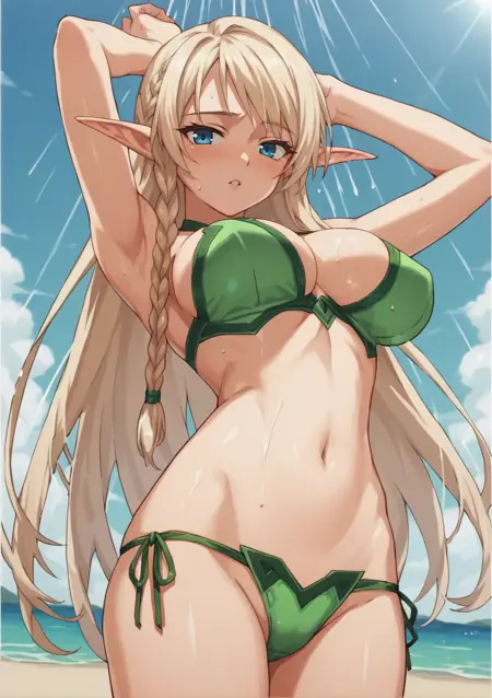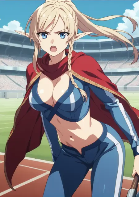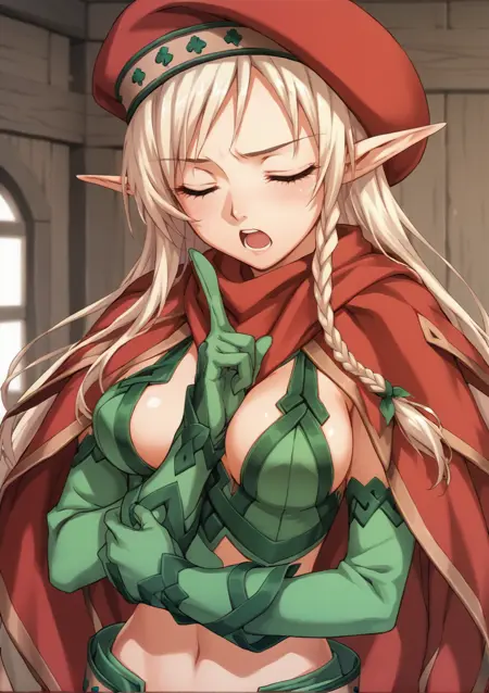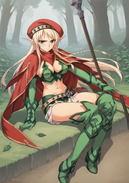 Notable tags: pointy ears, blue eyes, braid, long hair, gloves, beret, boots, side braid, cape, elbow gloves, blonde hair, thigh boots