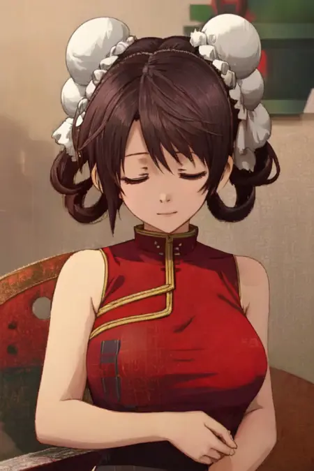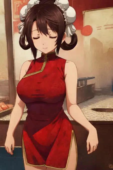 Yang5Seconds, 1girl, solo, short hair, large breasts, brown hair, black hair, red dress, bare shoulders, closed eyes, sleeveless, hair bun, double bun, chinese clothes, side slit, bun cover