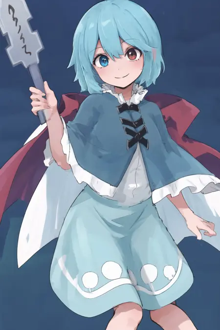 MOT,light blue hair,short hair,cape ,blue dress,heterochromia, smile,red eye,blue eye