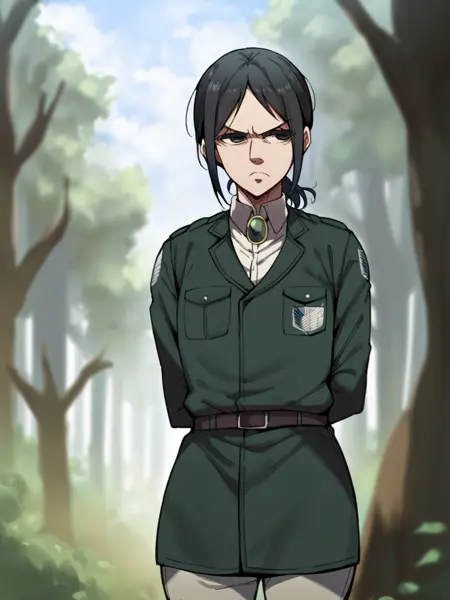 イエガリスト衣装プロンプト:pieckjaegerist, ponytail, black eyes, brooch, military uniform, green long coat, survey corps \(emblem\), knee boots