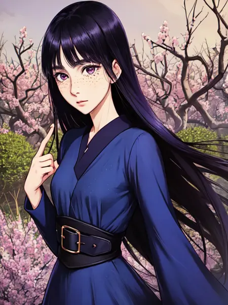 purple eyes, black hair, freckles