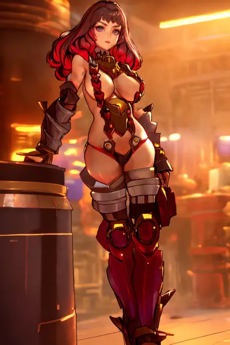 トリガー スラット:1girl、ロングヘア、マルチカラー髪、メカ娘、アーマー、爪、露出度の高い服、肩出し、アンダーブラスト、サイドブラスト、胸元の強調