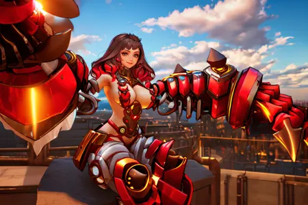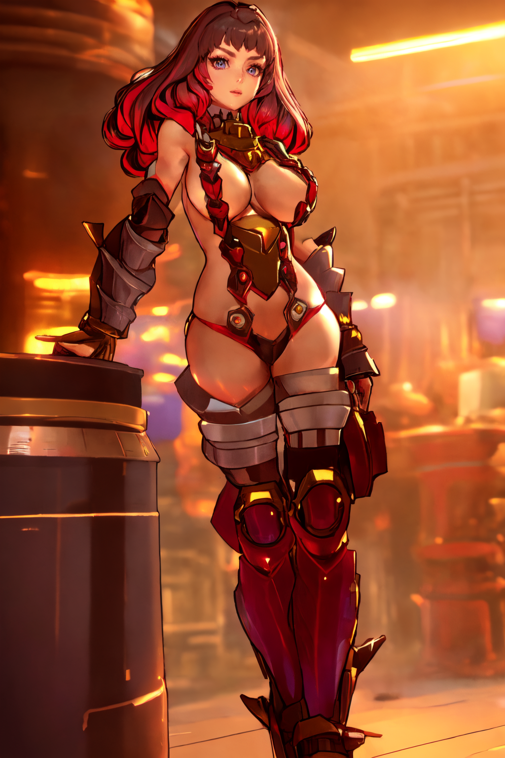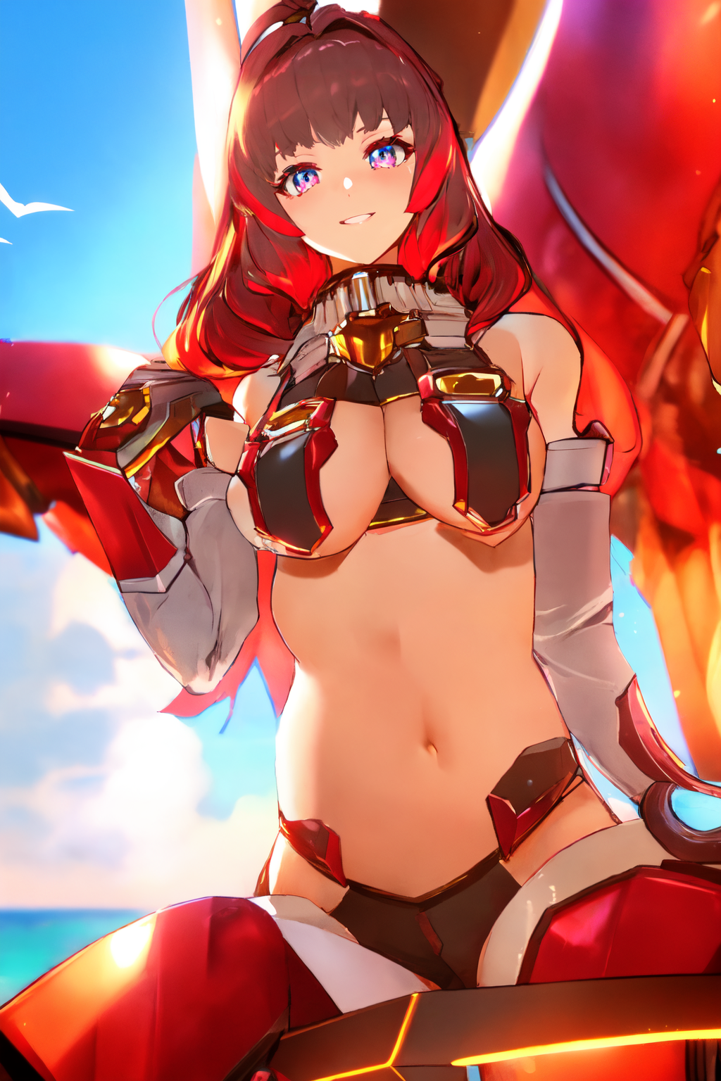 Trigger Slut : 1girl, long hair, multicolored hair, mecha musume, armor, claws, revealing clothes, bare shoulders, underboob, sideboob, cleavage