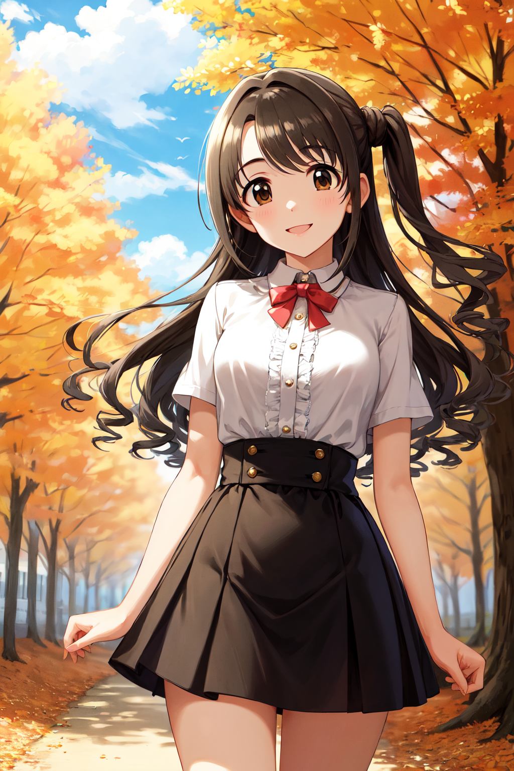 outfit1aauzuki, long hair, one side up, brown eyes, school uniform, red bowtie, blazer, brown jacket, long sleeves, plaid skirt, red skirt