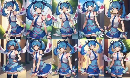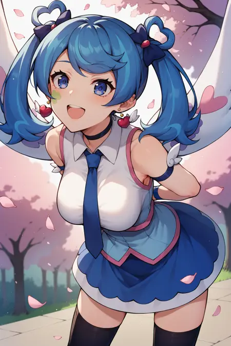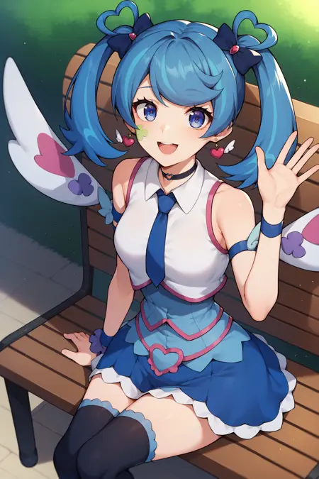 服装1aaangel, twintails, blue hair, hair bow, blue bow, blue eyes, facial mark, heart earrings, wings, heart, choker, blue necktie, sleeveless shirt, white shirt, arm strap, blue skirt, black thighhighs