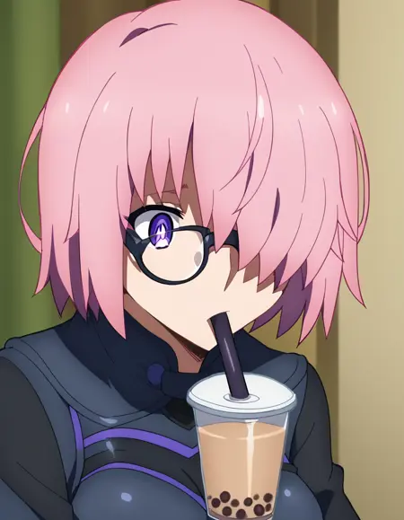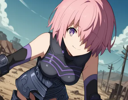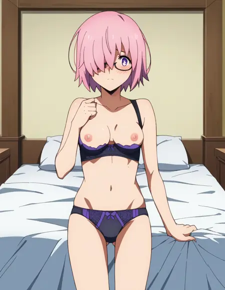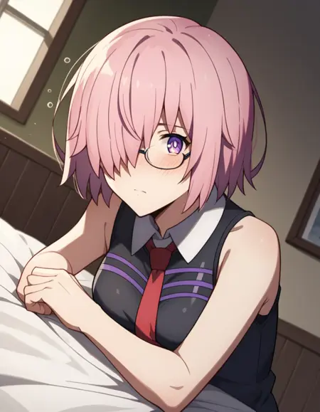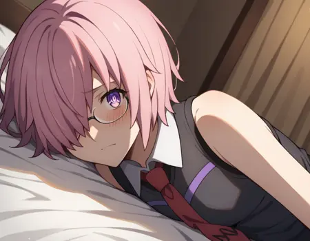 mash kyrielight, short hair, purple eyes, pink hair, hair over one eye,