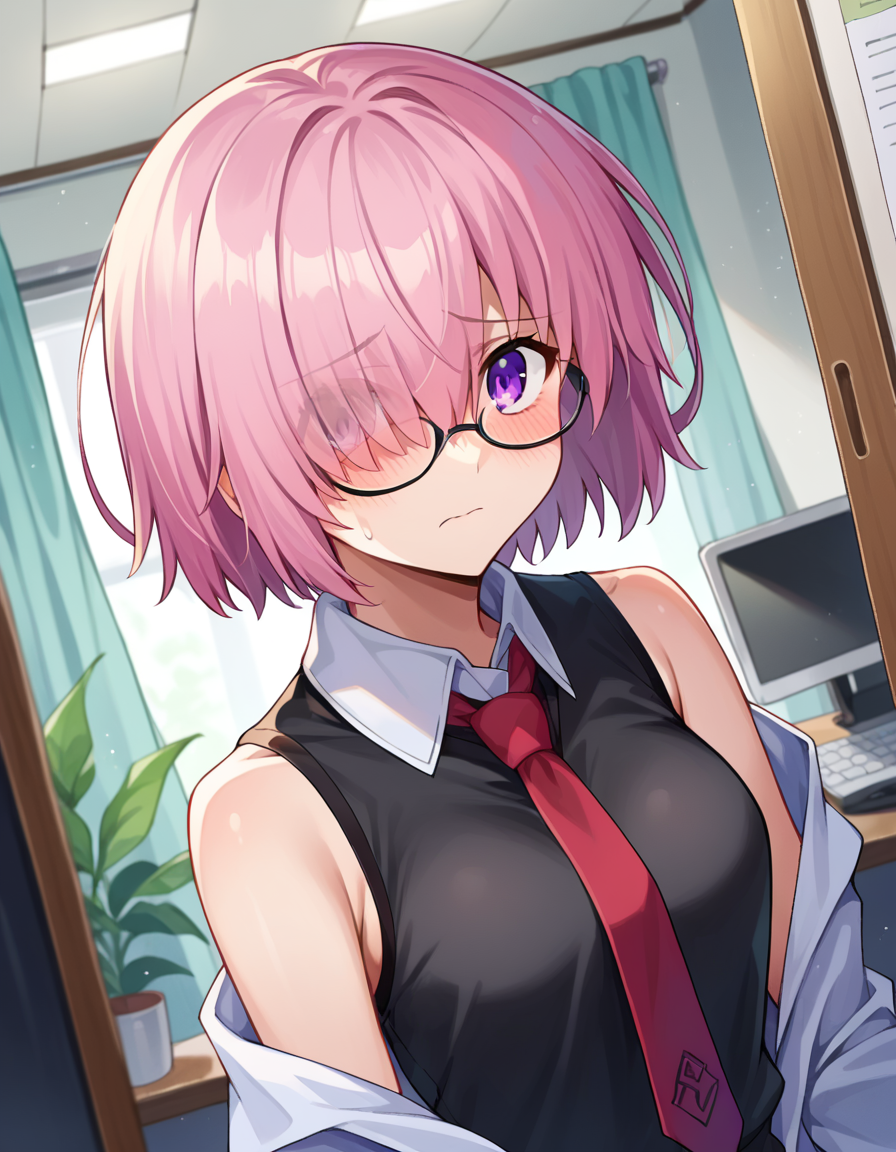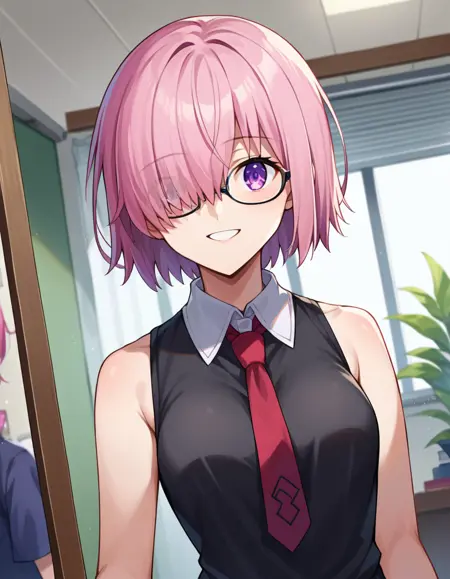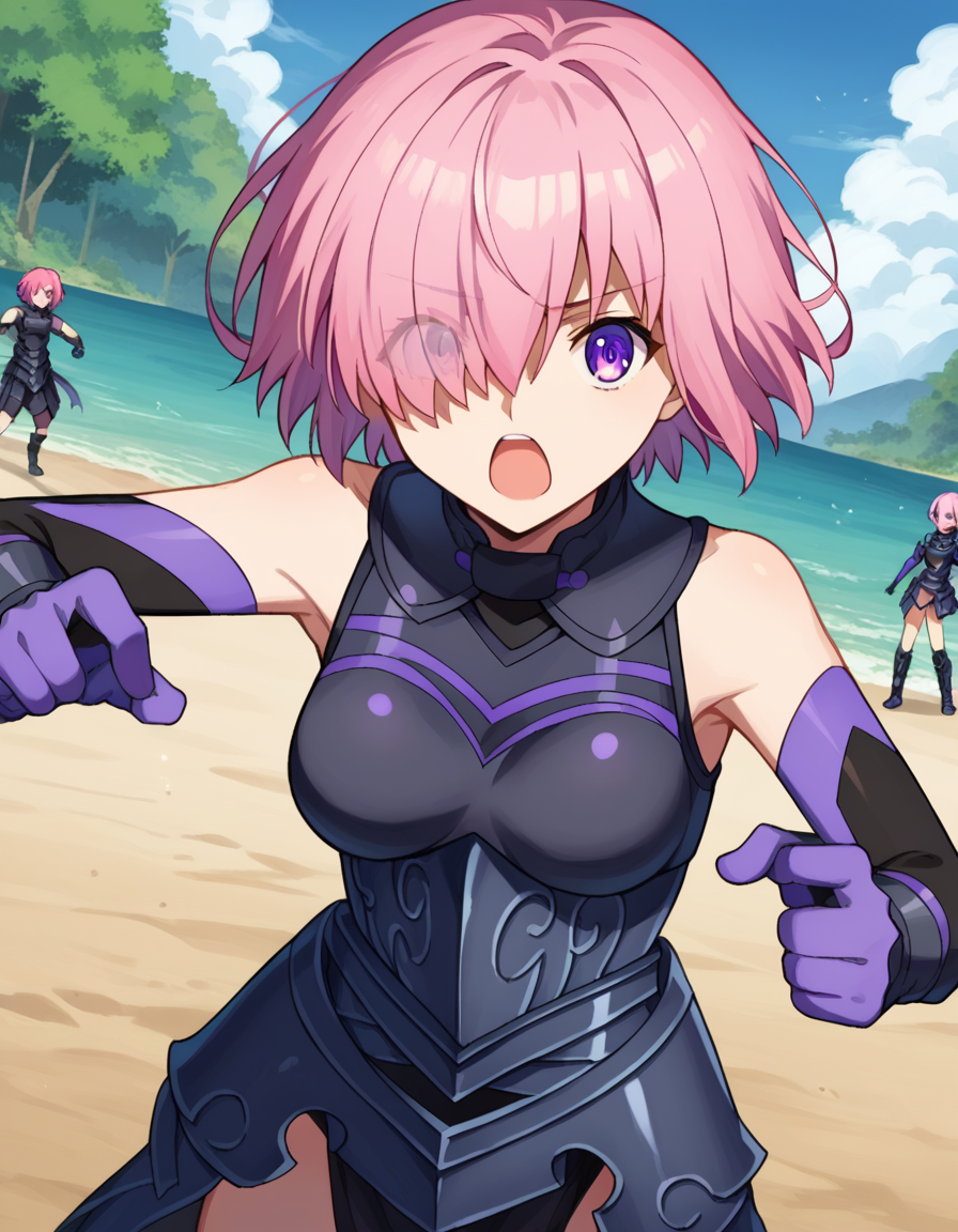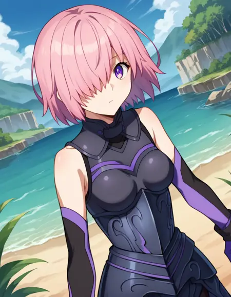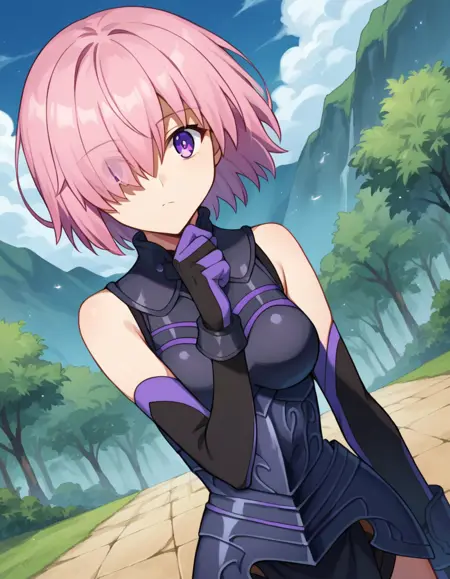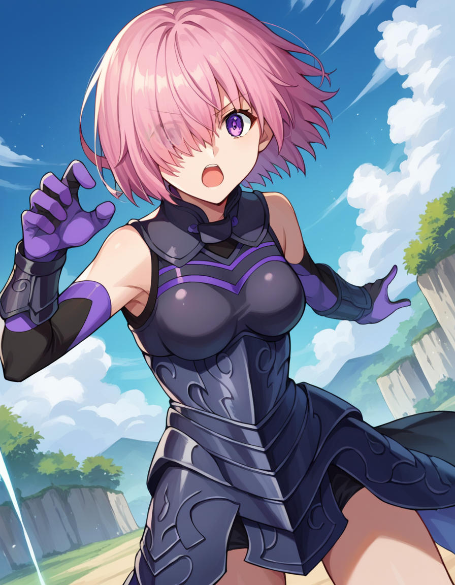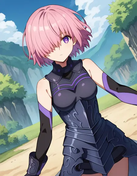 mash kyrielight, short hair, purple eyes, pink hair, hair over one eye,
