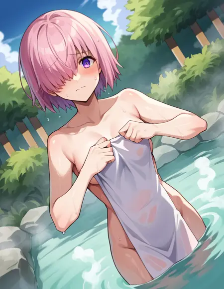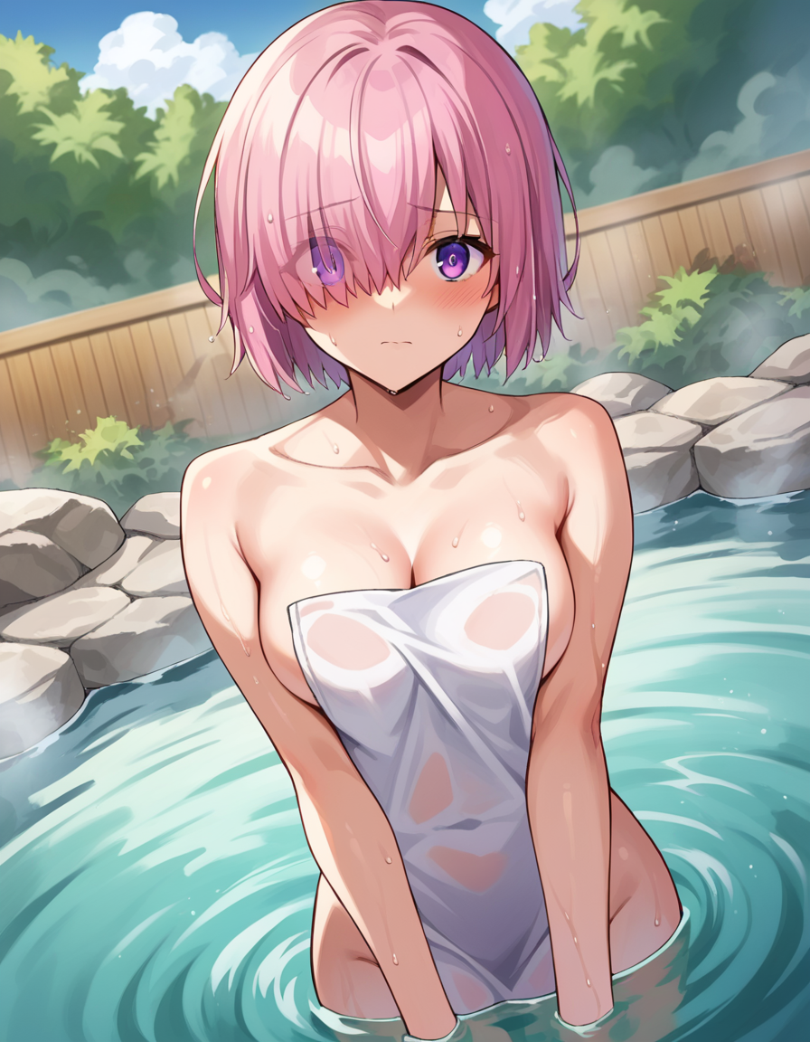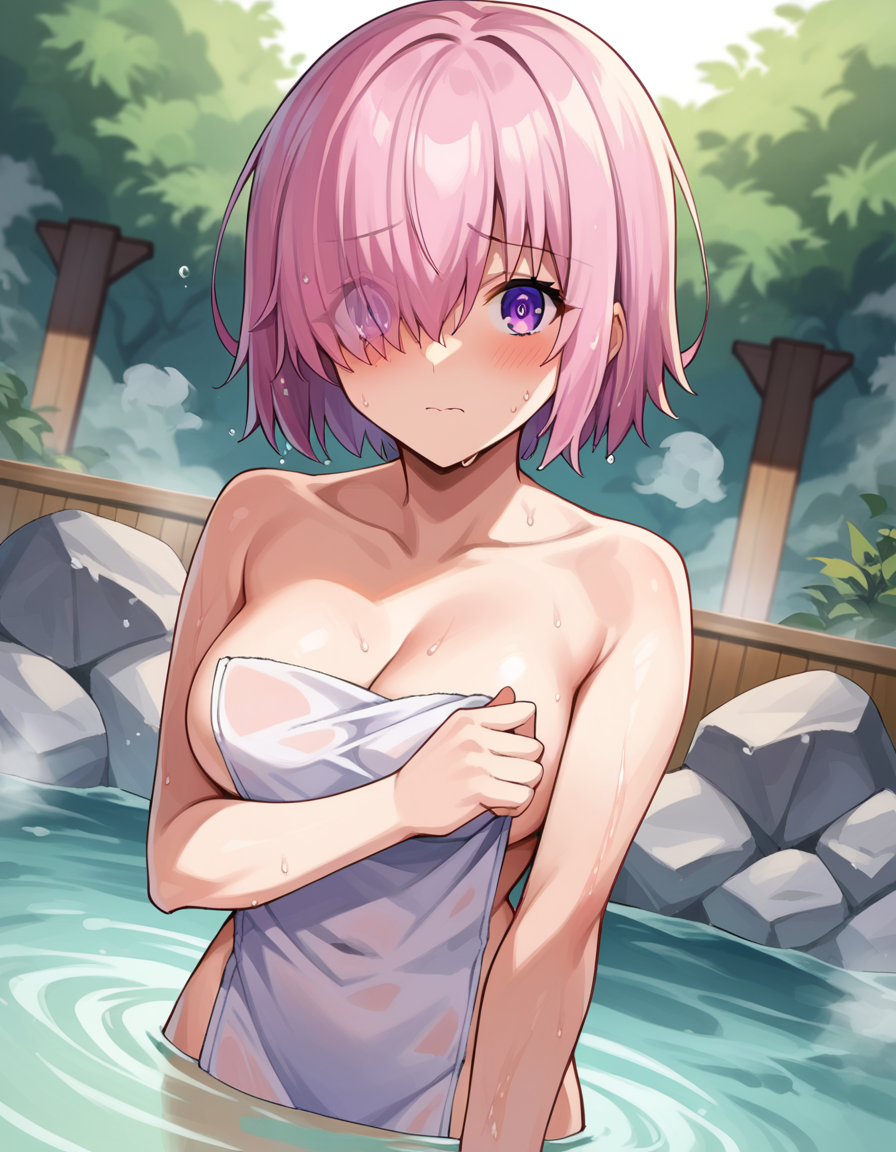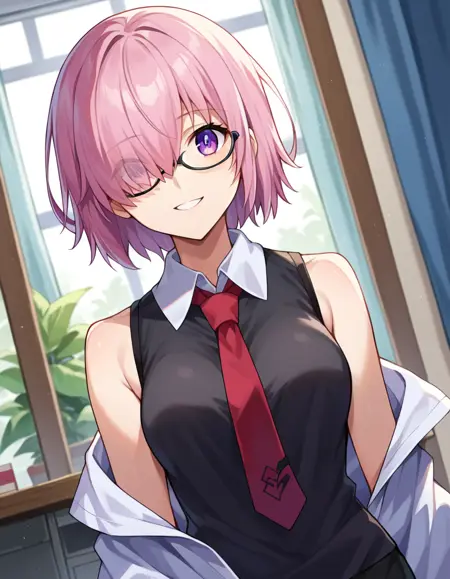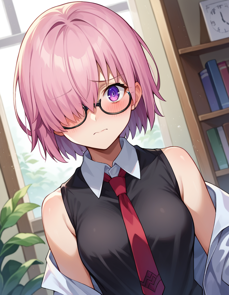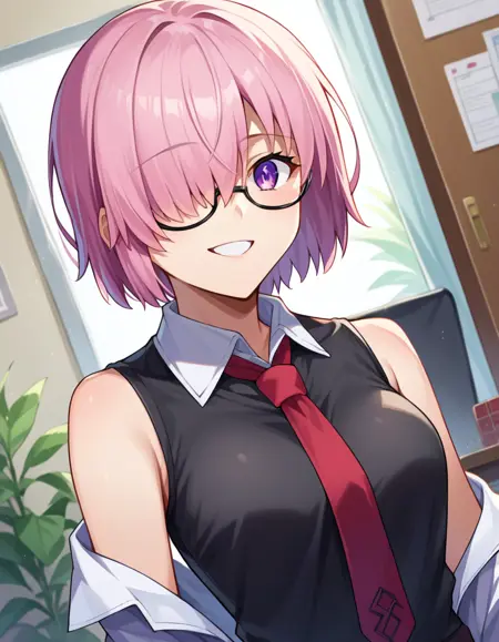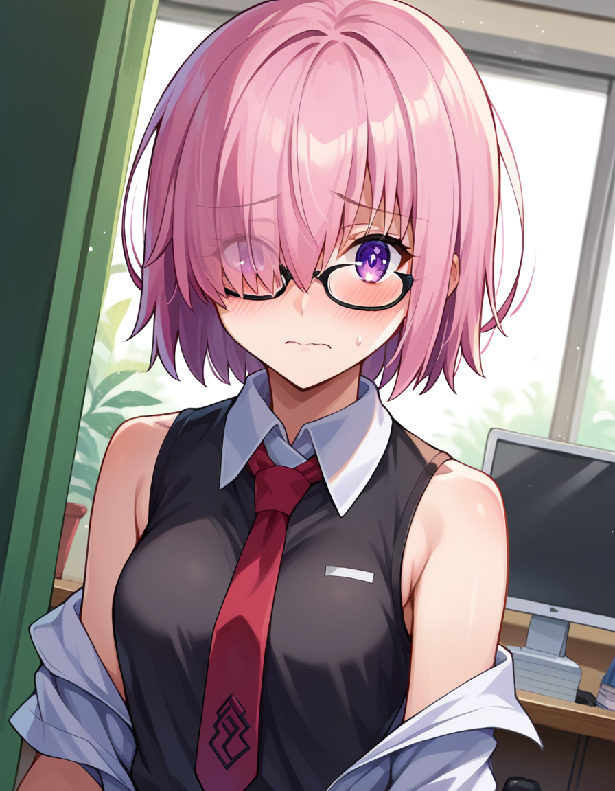 mash kyrielight, short hair, purple eyes, pink hair, hair over one eye,