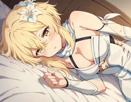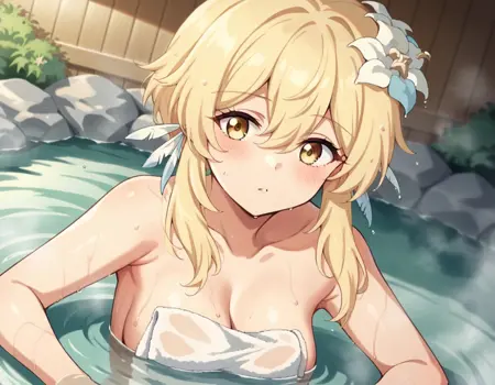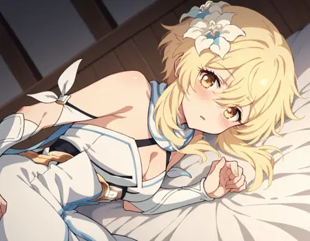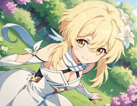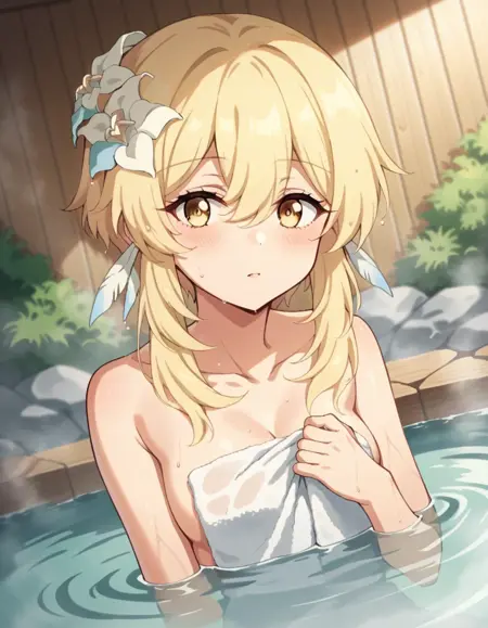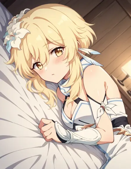 lumine, bangs, blonde hair, hair ornament, hair between eyes, yellow eyes, flower, hair flower, feather hair ornament,