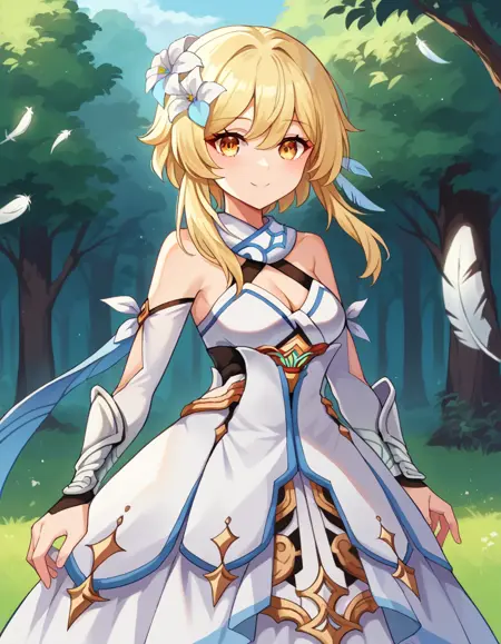 lumine, bangs, blonde hair, hair ornament, hair between eyes, yellow eyes, flower, hair flower, feather hair ornament,