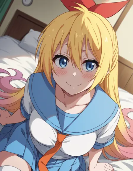 chitoge kirisaki, long hair, blue eyes, blonde hair, ribbon, hair between eyes, very long hair, hair ribbon, multicolored hair, red ribbon, gradient hair,