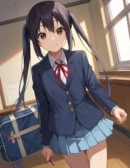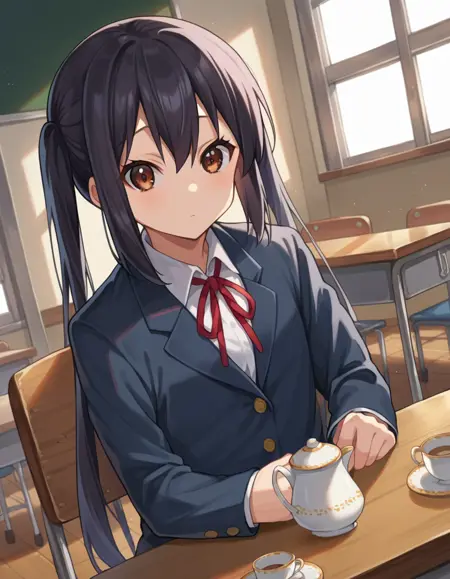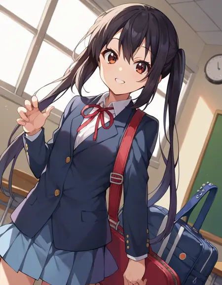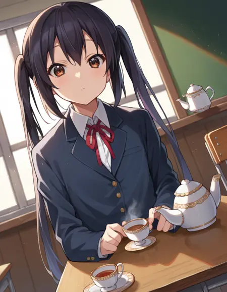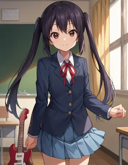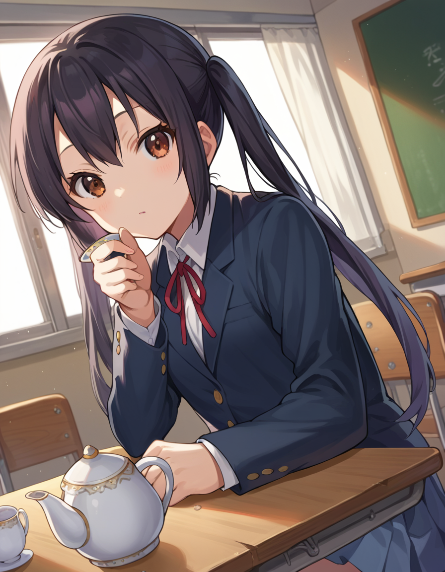 azusa nakano, black hair, brown eyes, long hair, twintails,