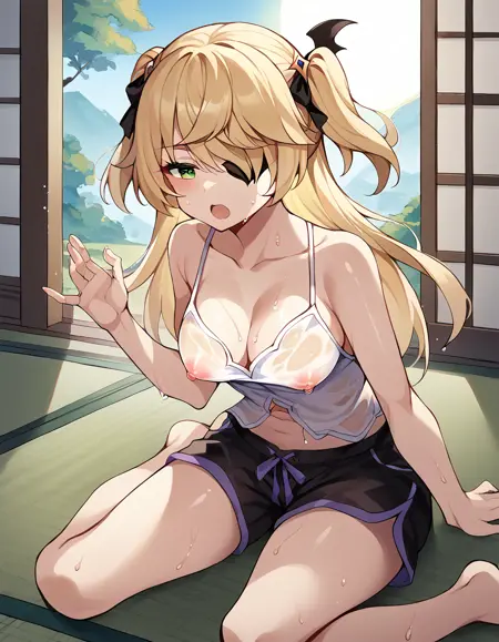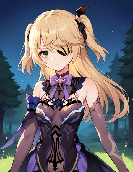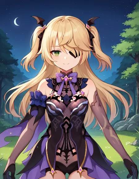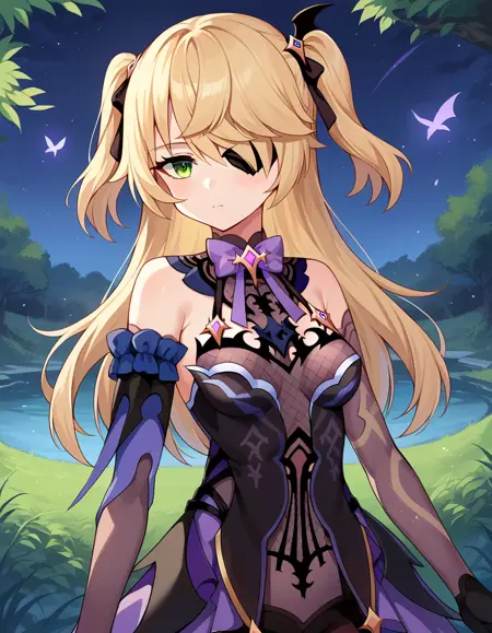 fischl, long hair, bangs, blonde hair, ribbon, green eyes, hair ribbon, hair over one eye, two side up, eyepatch,