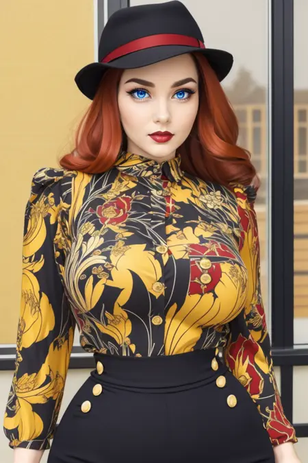 关键词:HUD_Gth_Wrk,帽子,裤子,纽扣,红色,黑白黄相间衬衫