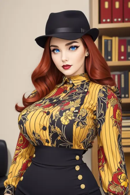 HUD_Gth_Wrk, hat, pants, buttons, red, black and yellow patterned shirt
