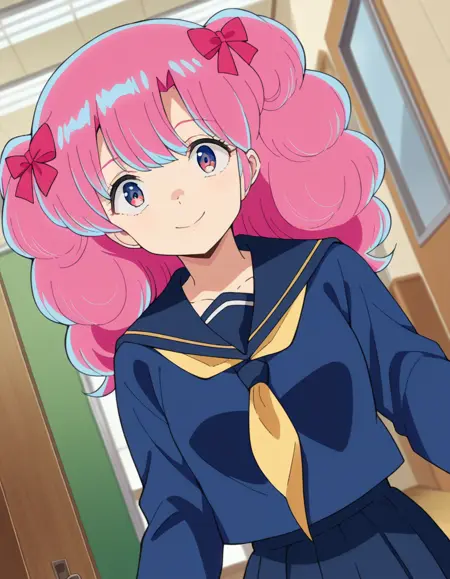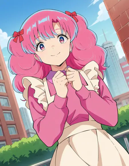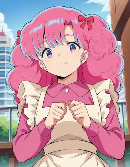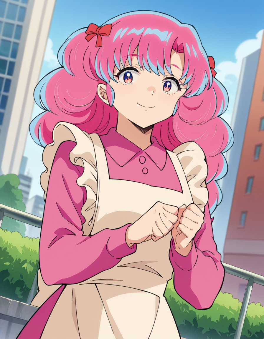 ran, long hair, bangs, pink hair, bow, hair bow, red bow, pink eyes,