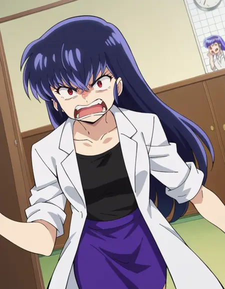 labcoat, white labcoat, collarbone, shirt, black shirt, skirt, pencil skirt, purple skirt,