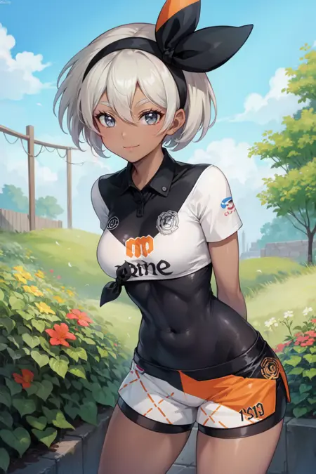 bea, short hair, hairband, dark skin, dark-skinend female, black hairband, hair between eyes, bow hairband, shirt, short sleeves, bodysuit, black bodysuit, shorts, gloves, bodysuit under clothes, collared shirt