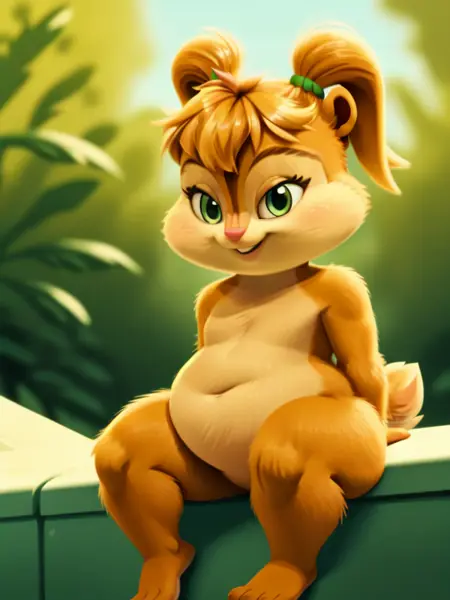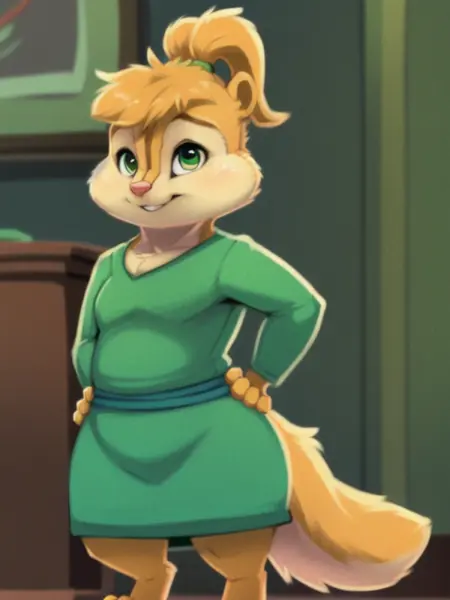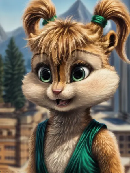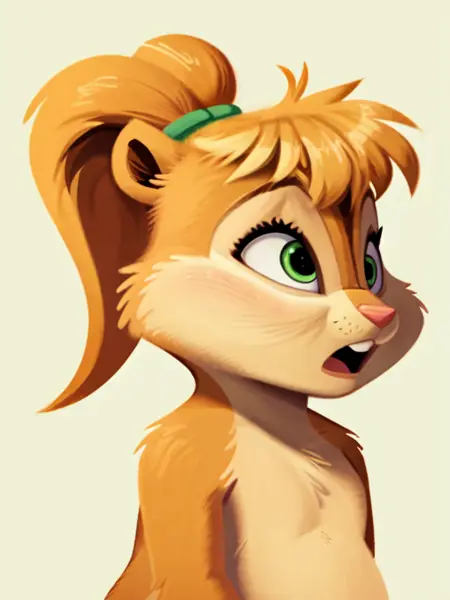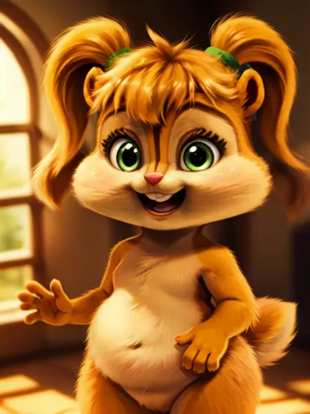 Standard tokens: Eleanor, chipmunk, girl, flat chest, orange body, orange head, orange arms, orange legs, orange tail, orange hair, beige belly, beige cheeks, beige eyelids, green eyes, pink nose, two braids on the head, green elastic bands on the braids, mouth closed
