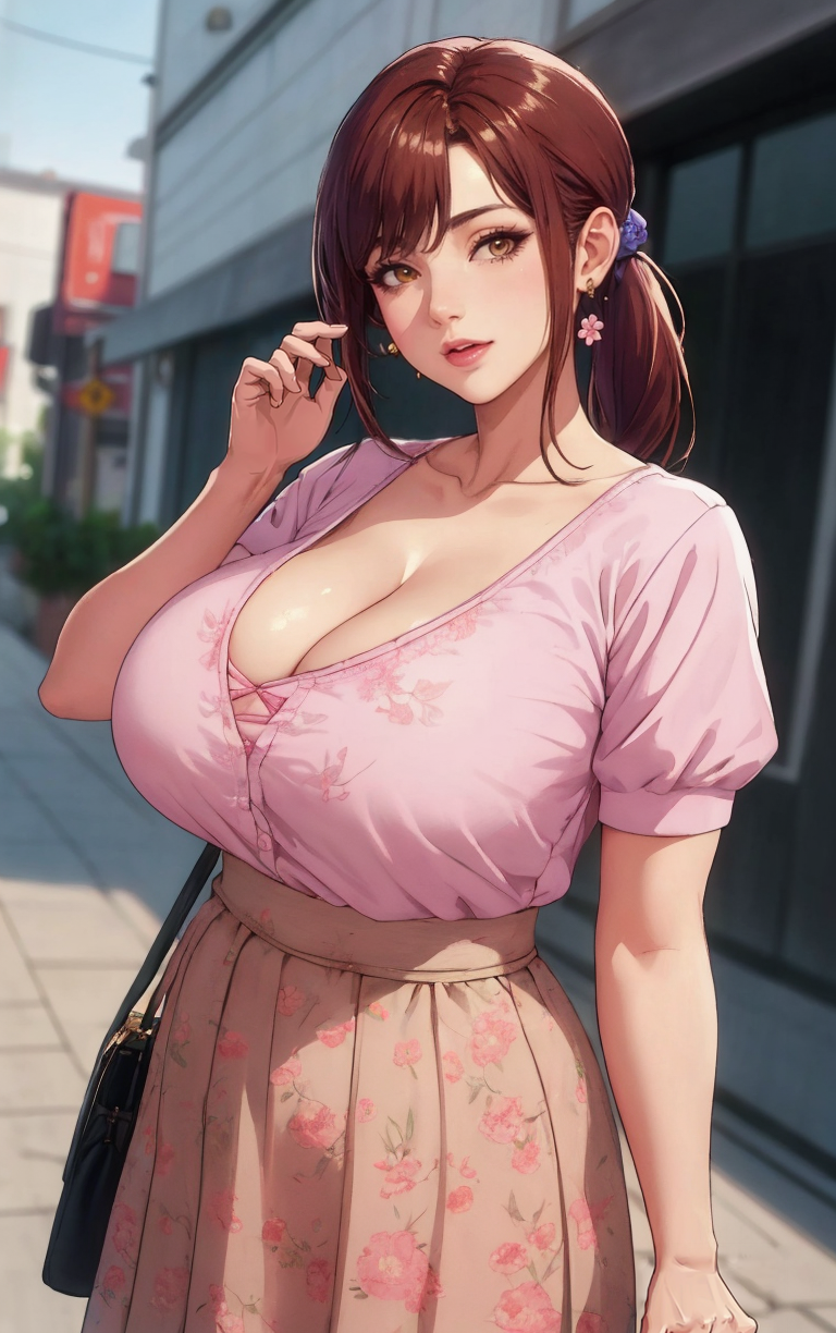 1girl, brown hair, long hair, brown eyes, jewelry, earrings, mature female, breasts, ponytail, large breasts, lips, huge breasts, lipstick, makeup, collarbone, hair ornament,