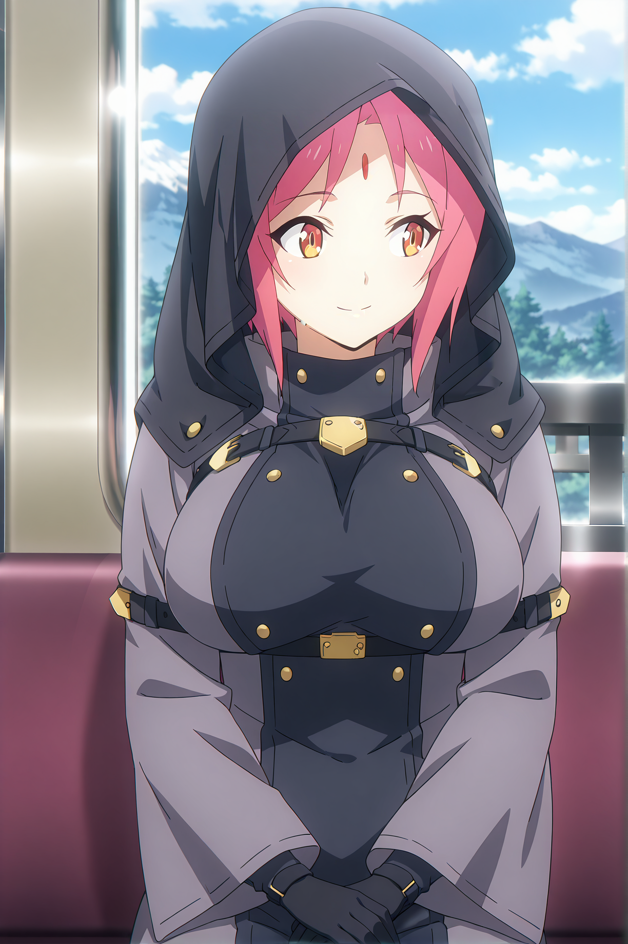 gloves,black gloves, long sleeves, coat, buttons, forehead jewel, wide sleeves, hood, cloak