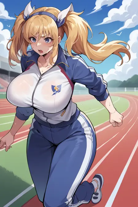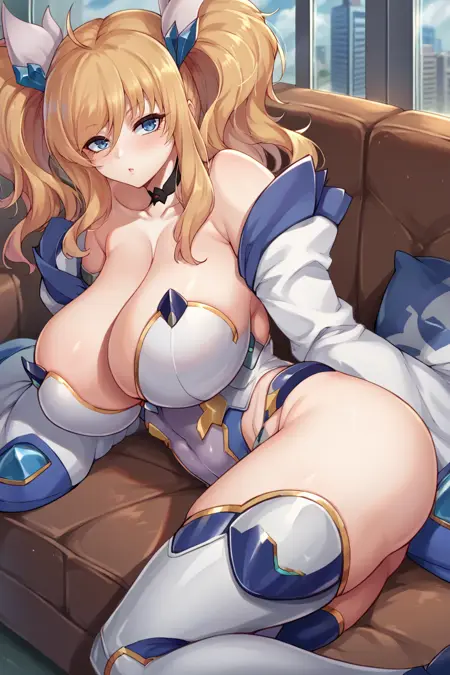 为她的《Action Taimanin》造型添加:“actionKirara, blonde hair, twintails, hair ornament, choker, cleavage, highleg leotard, detached sleeves, thighhighs”。