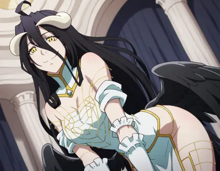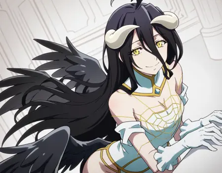 albedo, ahoge, black hair, horns, long hair, yellow eyes,