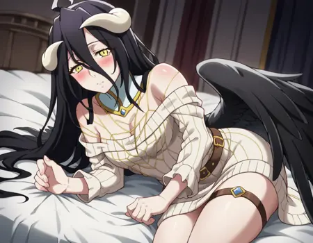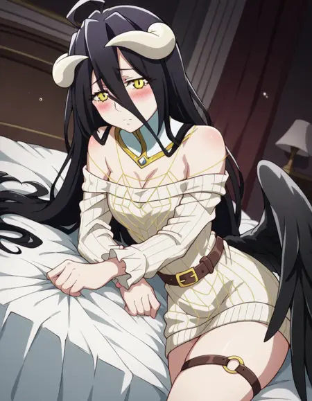 bare shoulders, belt, black wings, collarbone, dress, feathered wings, frills, long sleeves, low wings, necklace, off shoulder, off-shoulder sweater, sweater, sweater dress, thigh strap, white sweater, wings, wrist ribbon, thighs,