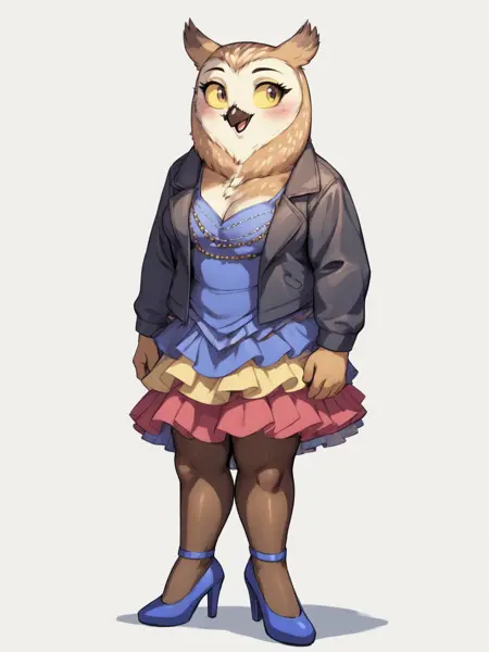 部分剧集截图与粉丝艺术(仅1幅由艺术家创作)被使用,并填充了生成图像(原型LORA)。你需要为她指定服装,否则她只是一只拥有心形羽毛的普通穴鸮,由“Furry”检查点生成。