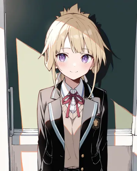 便装:1个女孩,单独,长发,裙子,金发,紫色眼睛,马尾,丝带,校服,白衬衫,有领衬衫,黑裙,红丝带,黑夹克,颈饰丝带,西装外套,棕色毛衣,