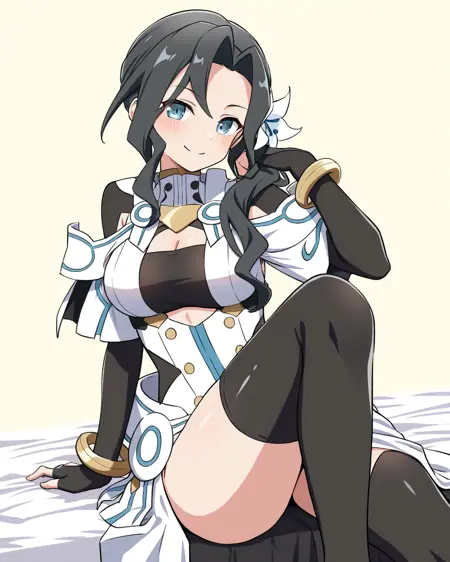 英雄形态:Renge英雄形态,miroku renge,1个女孩,单独,黑发,长发,黑色手套,蓝眼睛,侧马尾,黑色手套,肘部手套,黑色过膝袜,露指手套,白色连衣裙,盔甲,手镯,服装镂空,大腿靴,头发内收,胸部镂空,过膝袜,