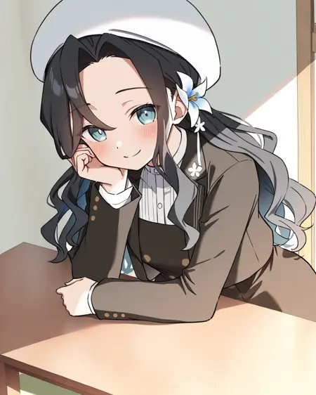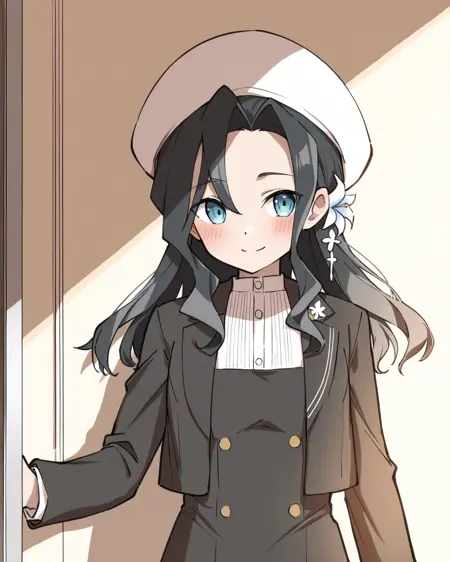 制服:miroku renge,1个女孩,单独,黑发,发饰,长发,蓝眼睛,刘海,发花,黑裙,白色头饰,花朵,长袖,帽子,白衬衫,黑色夹克,敞开的衣物,