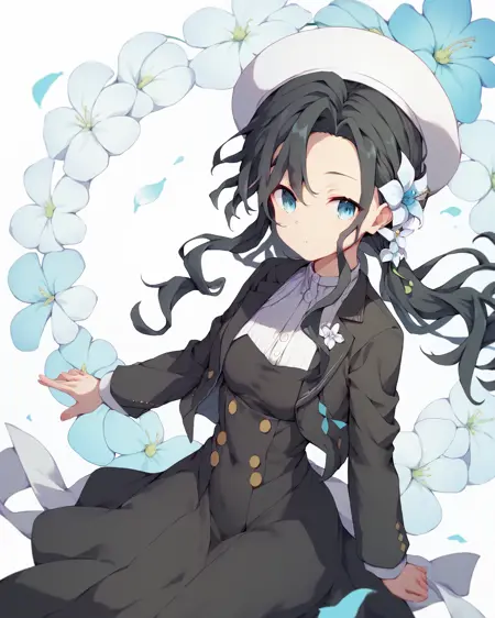 ユニフォーム:miroku renge、1girl、単独、黒髪、髪飾り、ロングヘア、青い目、前髪、髪の花、黒いドレス、白い頭飾り、花、長袖、帽子、白いシャツ、黒いジャケット、開いた服、