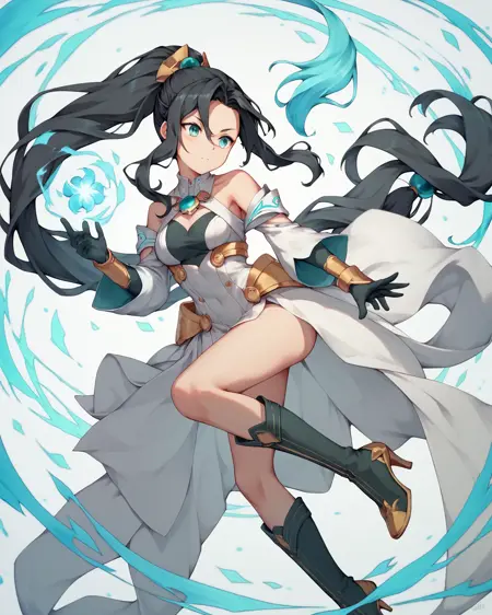 戦士服:1girl、単独、黒髪、ロングヘア、黒い手袋、ハイヒール、青い目、ポニーテール、緑の目、ブーツ、白いドレス、マジックガール、