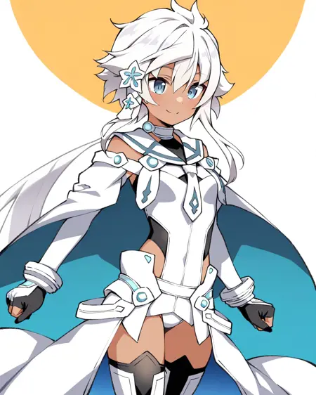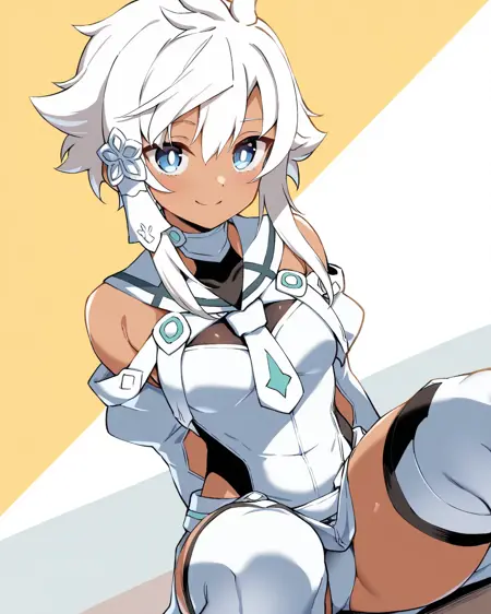 战士服装:1个女孩,单独,白发,短发带长发绺,短发,蓝色眼睛,发饰,深色皮肤,侧发,大腿袜,裸露肩膀,白发,白色连衣裙,紧身衣,
