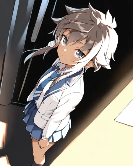 休闲装:1个女孩,单独,短发,灰色眼睛,棕色头发,短发带长发绺,侧发,浅深色皮肤,白色发带,校服,白衬衫,敞开的夹克,蓝色短裙,过膝袜,白色夹克,蓝色领带,