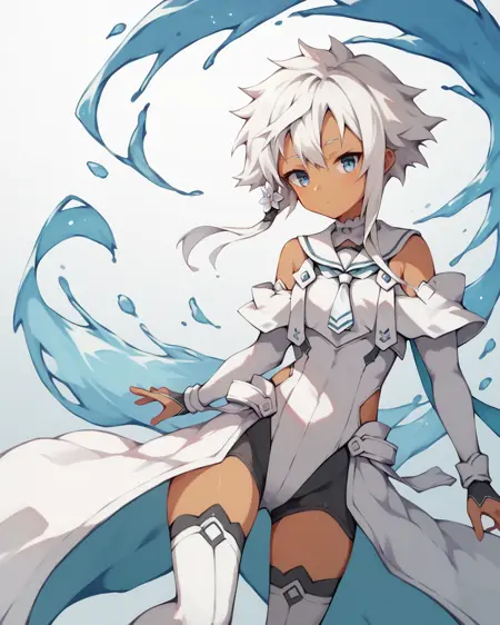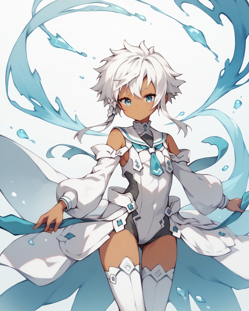 hero form : kohagura hero form,1girl, solo,white hair,short hair, with long locks,short hair, blue eyes,hair ornament,dark skin,sidelocks, thighhighs,bare shoulders,white hair,white dress, leotard,