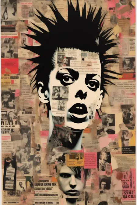 Punk collage is a form of art that incorporates the rebellious and do-it-yourself ethos of punk culture into the creation of collages. It emerged during the punk movement of the 1970s as a visual expression of the punk ideology, characterized by its raw, DIY aesthetic, political commentary, and subversive imagery.