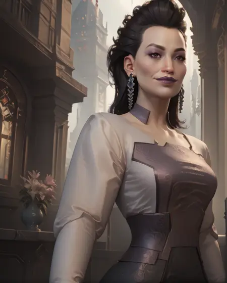 elizabeth, brown eyes, black hair, hair slicked back, or short hair, or medium hair, makeup,