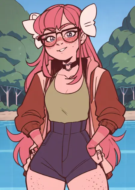 1girl, solo, long hair, red hair, hair ornaments, freckles, glasses,