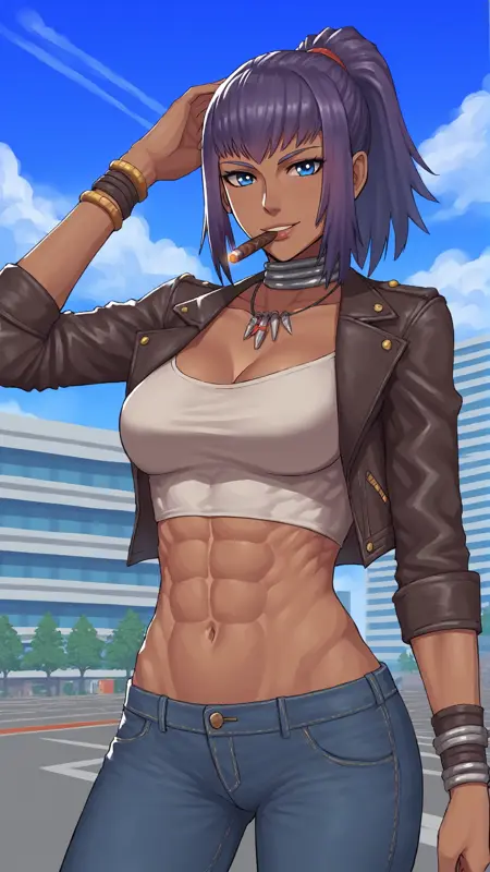 1여성, 태닝된 피부, 부족 헤어드레스, 숨긴 보라색 머리카락, 파란 눈, 금속 목걸이, 호랑이 무늬 비키니, 표범 무늬 치마, 팔찌, 깃털 액세서리, 배꼽, 글래디에이터 신발,