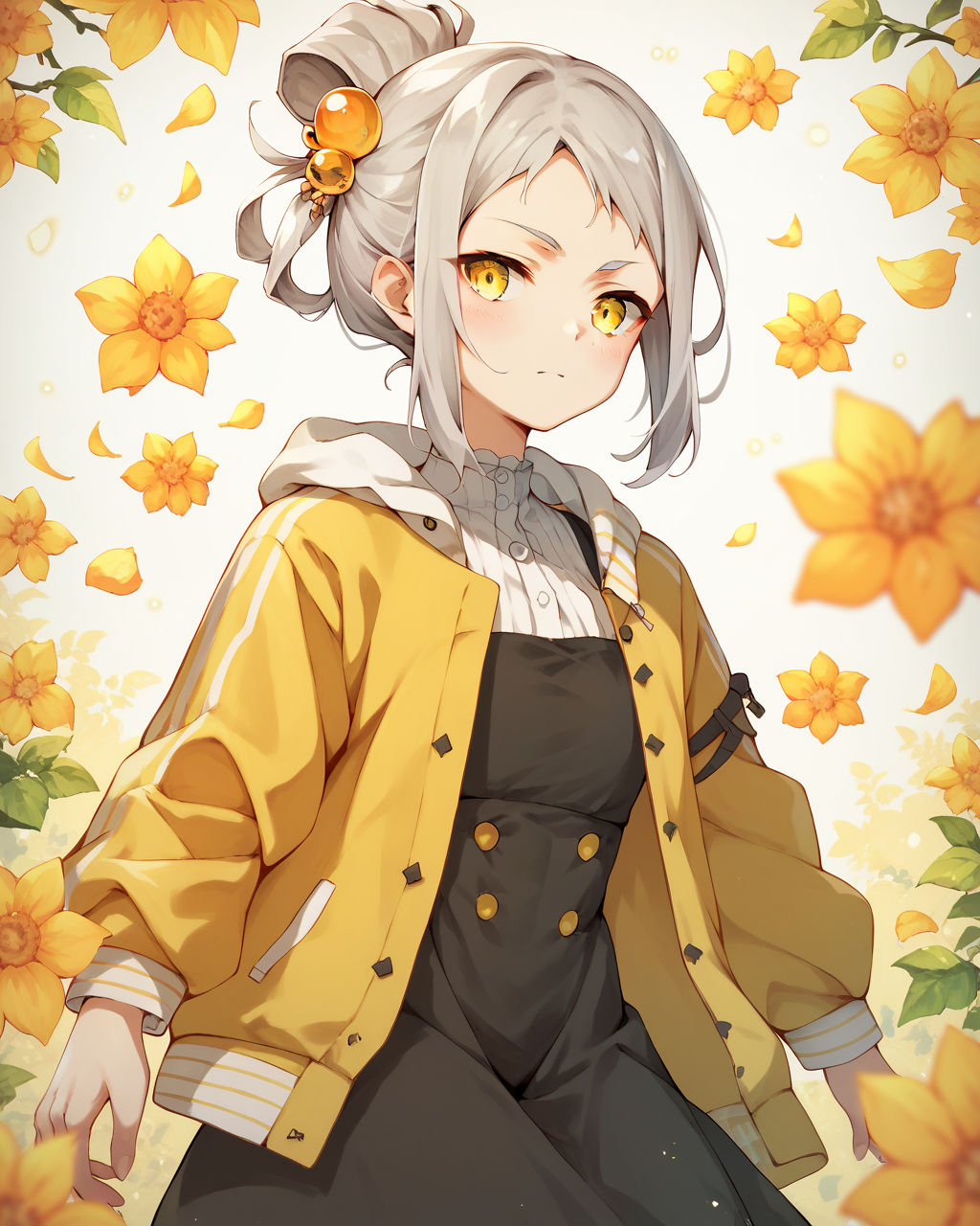 1girl, solo, 단일 머리 땋기, 노란 눈, 회색 머리, 머리 장식, 노란 재킷, 검은 드레스,